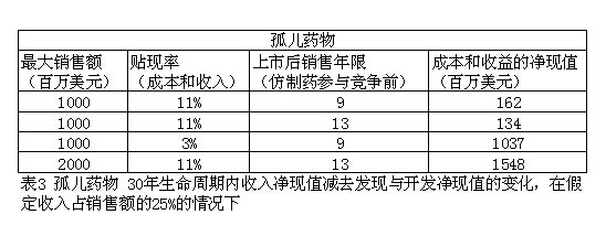 表3从不同的成本和收入角度,即使在高贴现率的情况下,重磅炸弹孤儿药物也是盈利的。