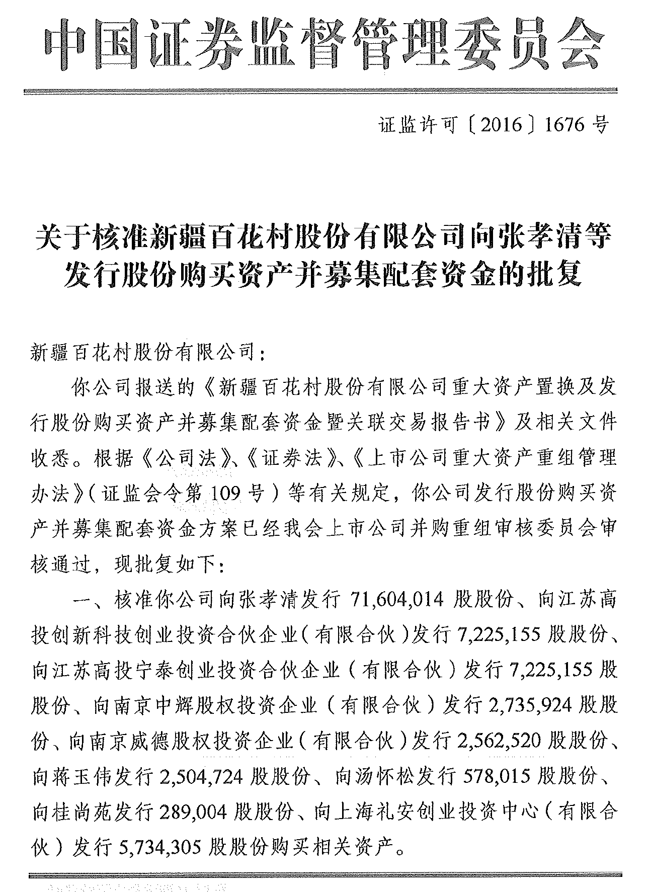 2016年8月1日,华威医药收到中国证券监督管理委员会“关于核准新疆百花村股份有限公司向张孝清等发行股份购买资产并募集配套资金的批复”文件。在完成相关手续后,华威医药将成为百花村(600721)全资子公司,百花村主营业务也将正式转型为医药大健康产业。华威医药将作为上市公司主营业务独立开展运营,在上市公司和资本市场的平台上,华威医药将一如既往为合作伙伴提供更专业、更规范、更有保障的药物研发全流程服务及一体化的解决方案。