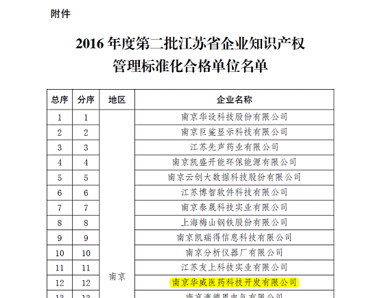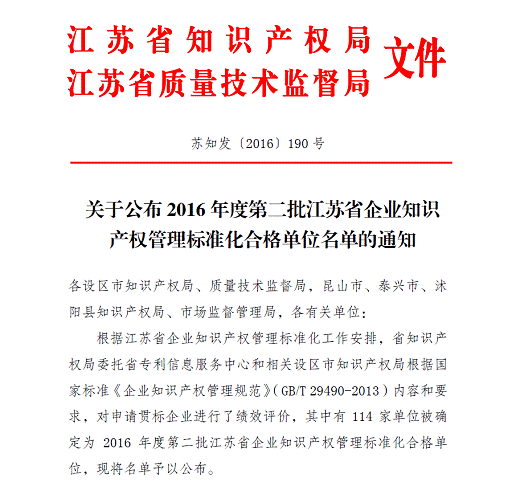 近日,接到苏知发〔2016〕190号通知,华威医药顺利通过知识产权管理体系“贯标”审核,成功获批江苏省知识产权“贯标”合格单位,使得公司知识产权的风险防范与自我保护多了一重保障,也进一步地给广大客户的权益增添了一重保障。
