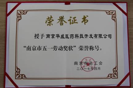 2017年4月28日,华威医药集团荣获2017年“南京市五一劳动奖状”荣誉称号,在南京市召开的庆“五一”国际劳动节暨纪念南京市总工会成立90周年大会上作为南京市30家获奖单位之一受到表彰。省委副书记、市委书记吴政隆代表市委、市人大、市政府、市政协,向受到表彰的先进集体和先进个人表示热烈祝贺,向全市广大干部职工、劳动群众致以节日问候和崇高敬意。市领导缪瑞林、陈绍泽、沈健、龙翔,省总工会副主席曹海出席。历届劳模代表、工会干部代表、职工代表,市委各部委、市府各委办局主要负责同志等共2300多人参加会议,我司政府事务总监苏玲女士出席表彰大会。