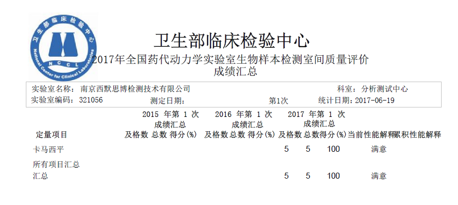 2017年6月20日,华威医药集团全资子公司南京西默思博检测技术有限公司以满分的成绩通过2017年全国药代动力学实验室生物样本检测室间质量评价,该评价是由卫生部临床检验中心组织实施,用于验证实验室对于生物样本检测能力,是公认的实验室检测质量认可的重要依据。西默思博拥有先进的分析测试设备和专业的技术人员,以质量求生存,以“科学、严谨、求是、卓越”的态度,提供规范、优质、高效的医药科研检测技术服务。本次满分通过彰显我单位具有专业可靠的检测实力。