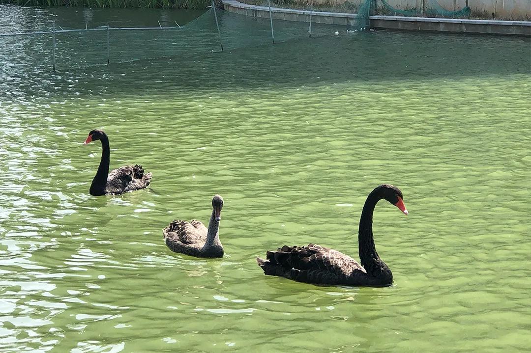 黑天鹅低头觅食、扑腾于湖上,温暖柔和的光线下,旗帜轻舞。
