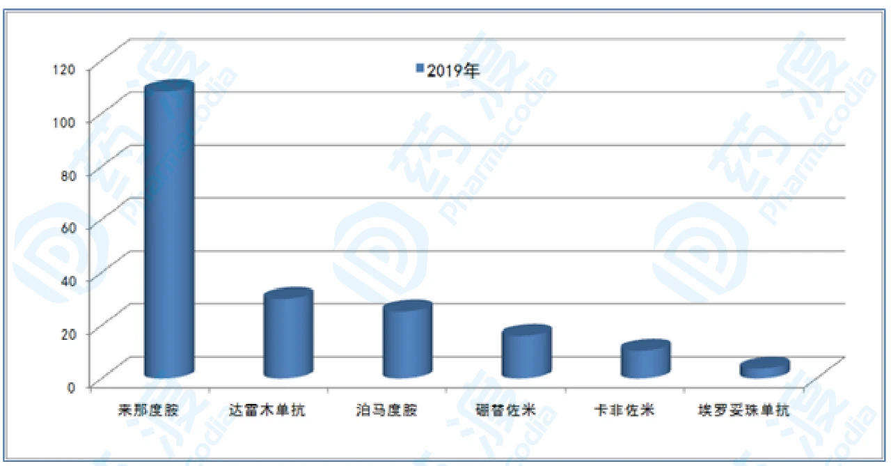 图1:2019年全球多发性骨髓瘤主要产品市场销售情况(单位:亿美元)