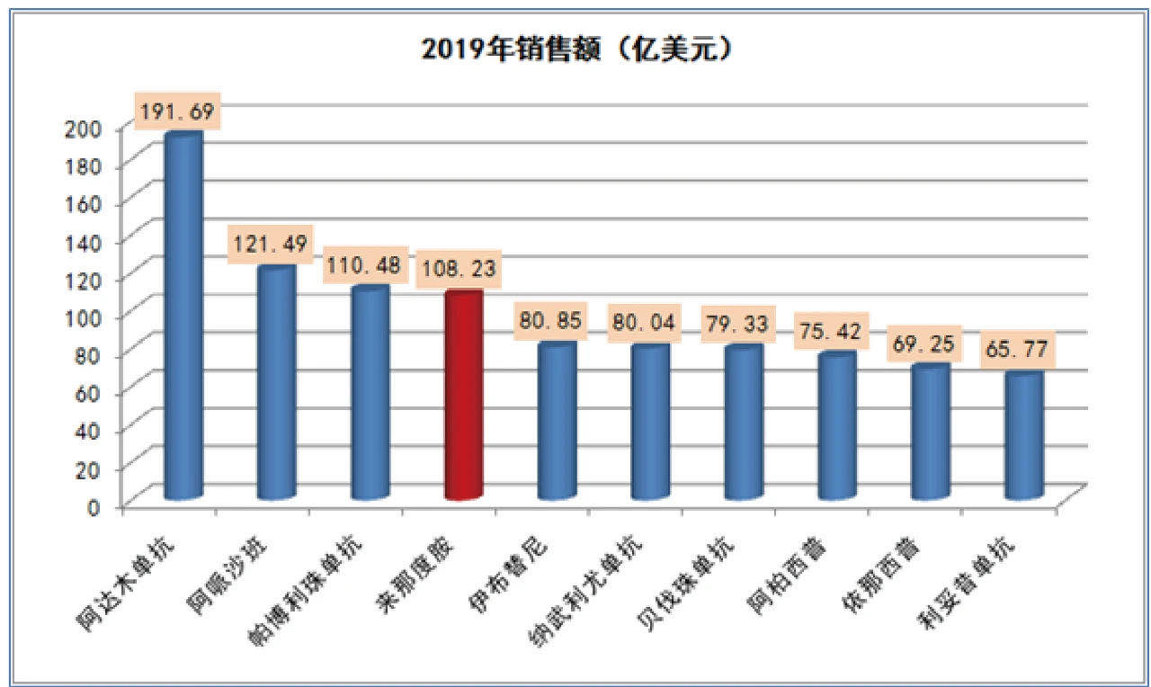 图2:2019年全球TOP10产品市场销售情况(单位:亿美元)
