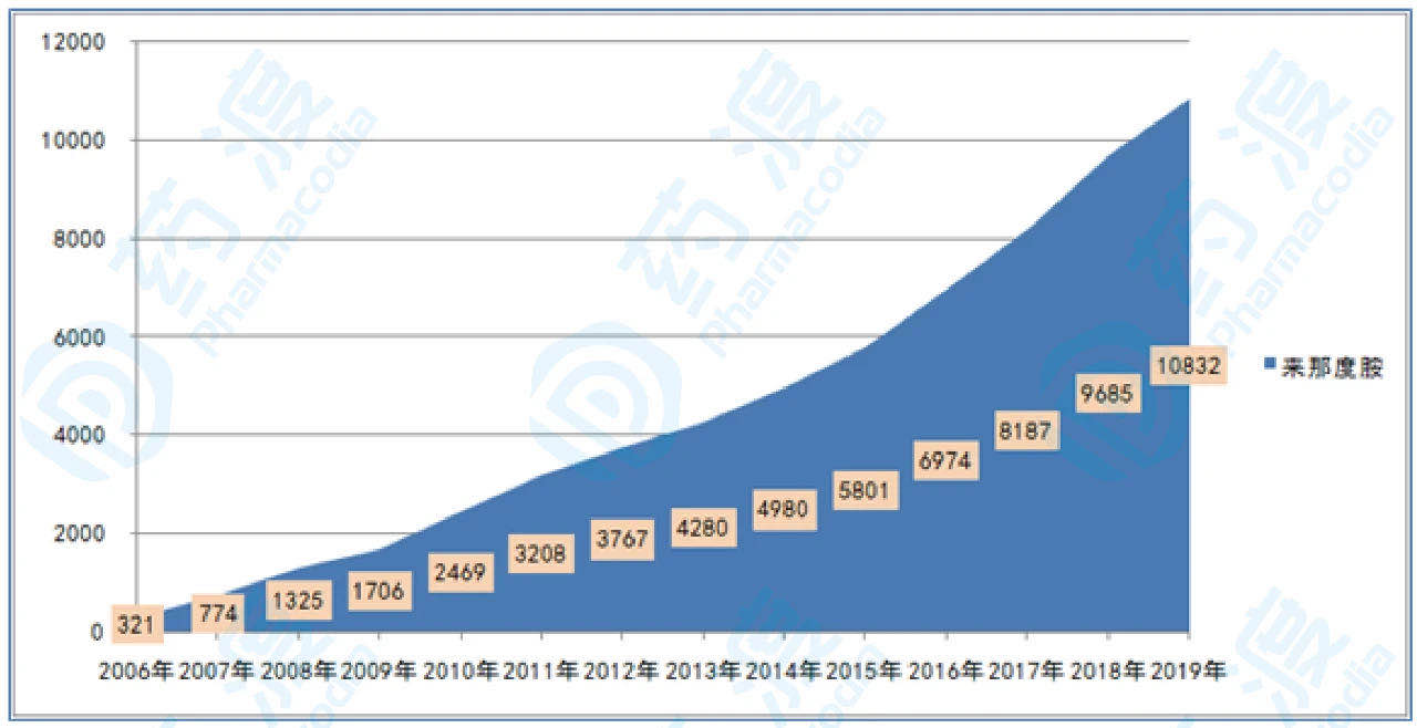 来那度胺由美国新基生物制药公司开发,商品名为Revlimid,剂型为胶囊剂,规格有5mg、10mg、15mg和25mg四种。2005年12月首获FDA批准用于治疗骨髓增生异常综合征,2006年获得FDA批准用于治疗多发性骨髓瘤。来那度胺是全球治疗多发性骨髓瘤的“金标准”药物,该产品最初是按照孤儿药获批,随着新适应症不断增加,销售额也逐年增加,已经成为小分子抗肿瘤药排名第一的重磅药物。