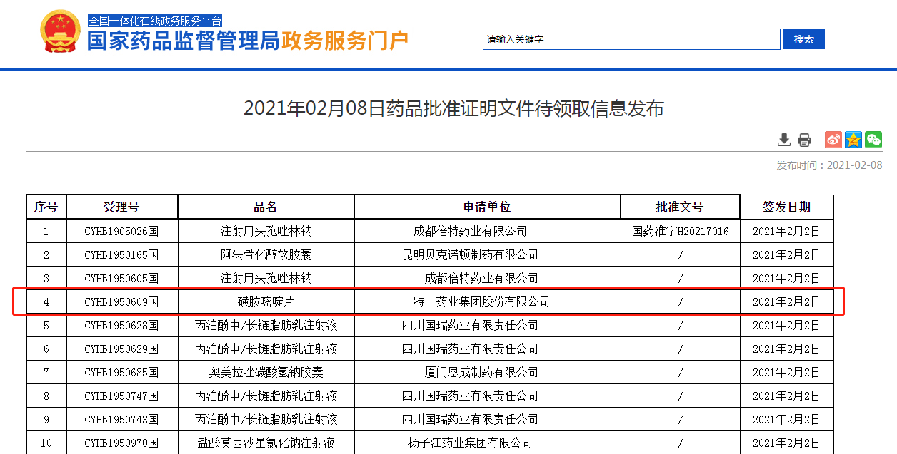 近日,国家药品监督管理局正式发布通知,特一药业集团有限公司申报的磺胺嘧啶片正式通过仿制药质量和疗效一致性评价。同时,这也是国内首家通过磺胺嘧啶片的企业。
