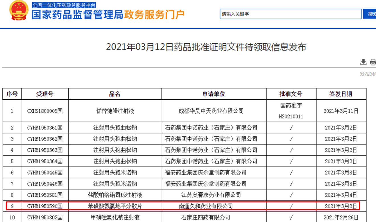 近日,国家药品监督管理局正式发布通知,南通久和药业有限公司申报的苯磺酸氨氯地平分散片正式通过仿制药质量和疗效一致性评价,成为首家过评企业!