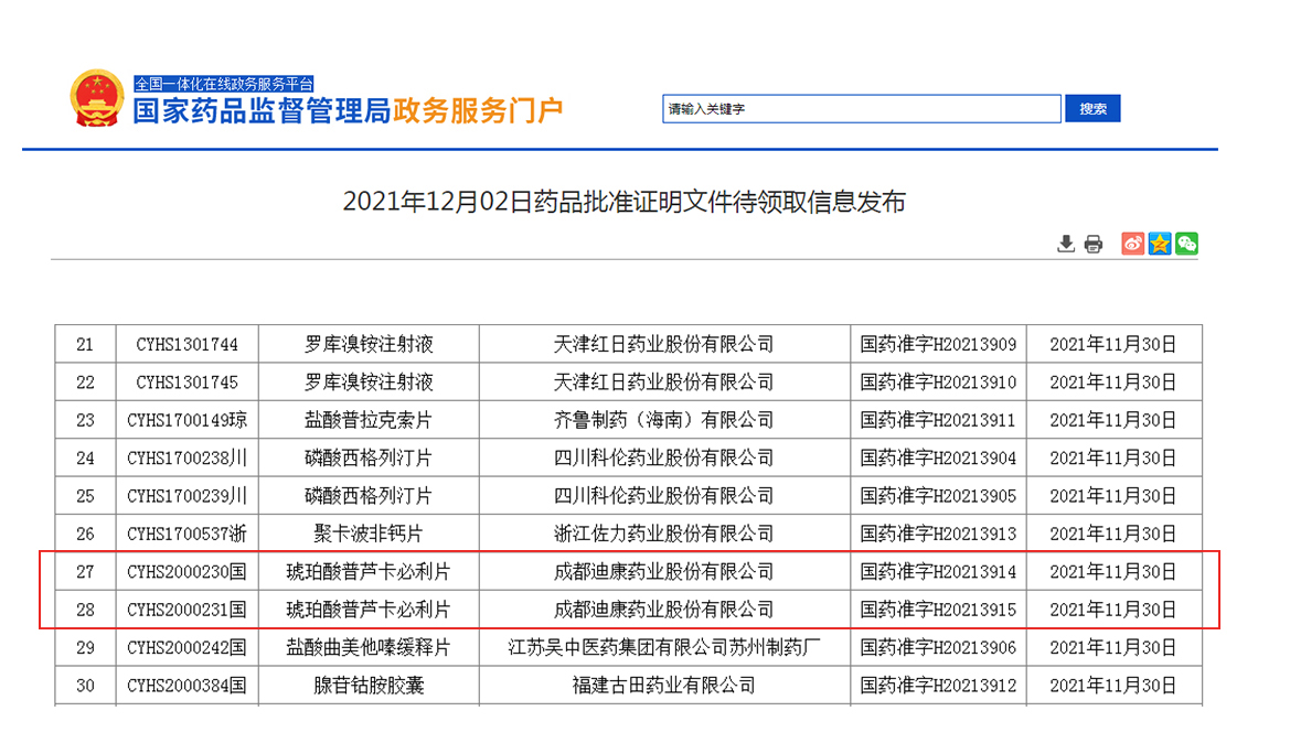 近日,国家药品监督管理局正式发布通知,华威医药受成都迪康药业股份有限公司委托的琥珀酸普芦卡必利片(1mg、2mg)项目正式通过审评审批,获得生产批件。