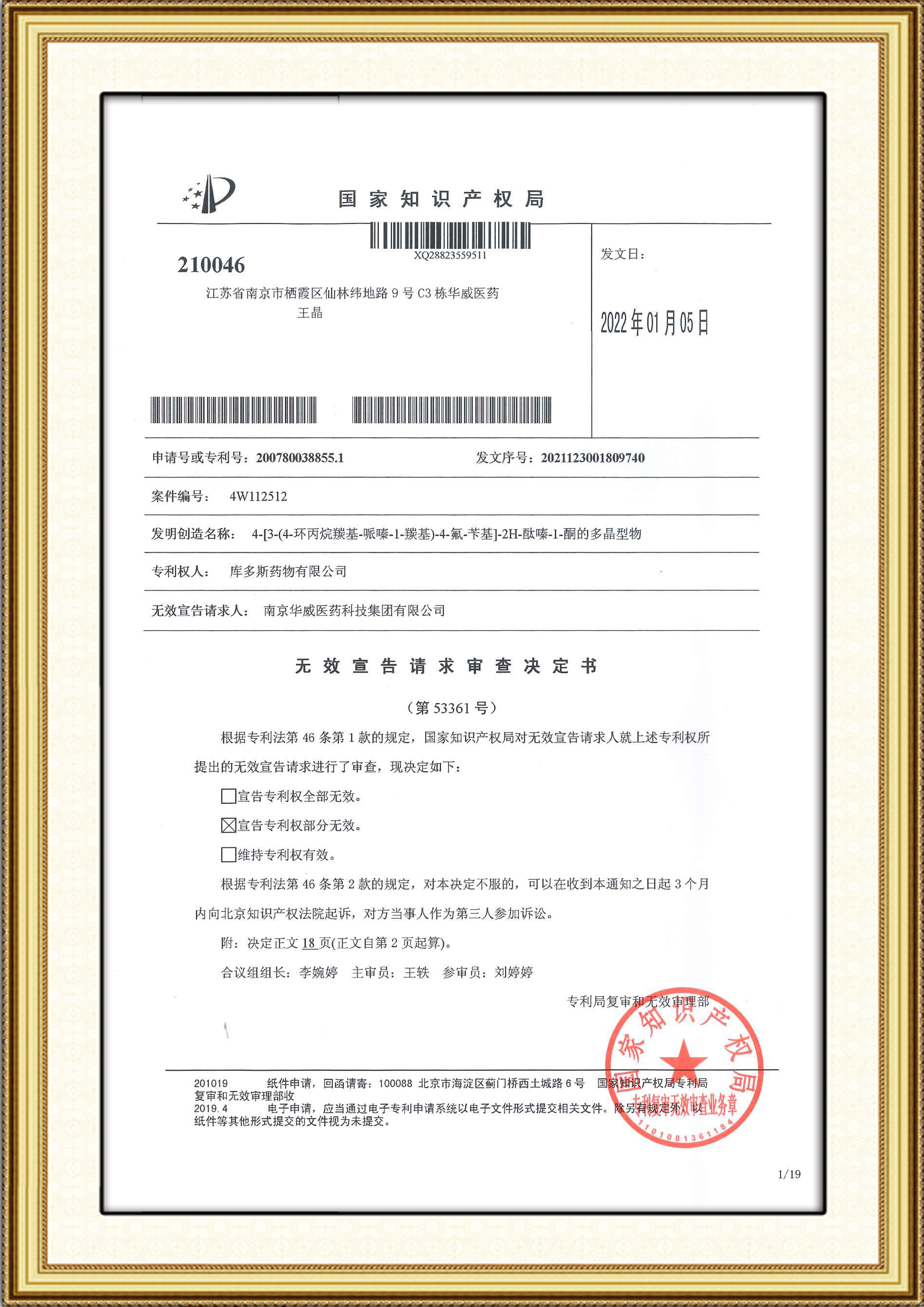 值得关注的是这是继上次成功挑战托比司特晶型专利后,我司又一次挑战重磅药物专利成功,再一次证明了我司不仅具有雄厚的研发实力,更有一支高水平的知识产权队伍为华威医药的研发保驾护航,数次为企业项目进展扫除专利障碍,规避侵权风险,最大程度保障企业及客户的利益。