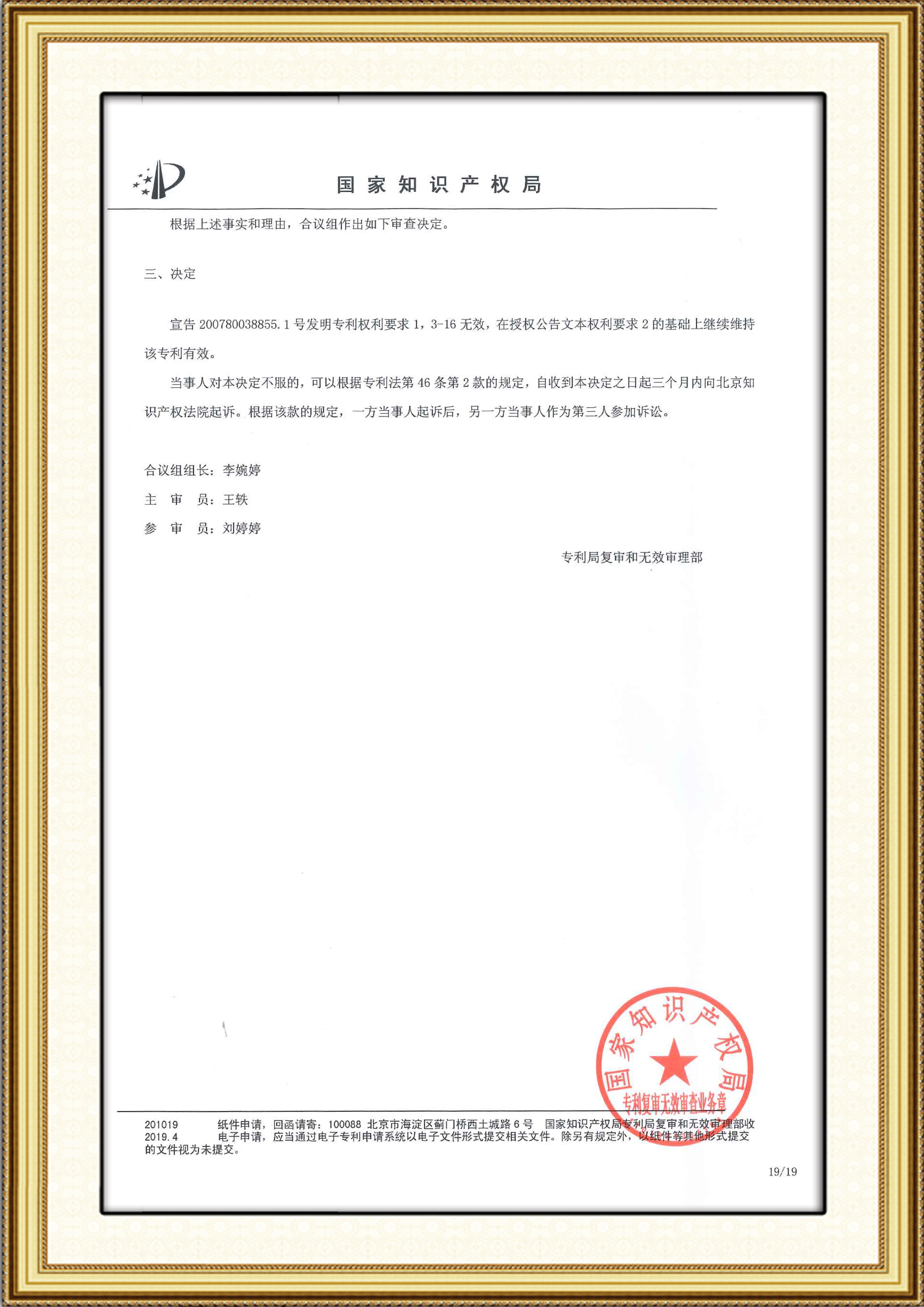 近日,我司收到国家知识产权局复审与无效审理部针对专利200780038855.1的无效宣告案件作出第53361号无效决定,宣告专利权部分无效(权1、3-16无效,权2维持有效)。因为在仅“权利要求2维持有效”的基础上,请求人制备的产品将不会落入该保护范围内,达到了本次专利无效挑战的目的。
