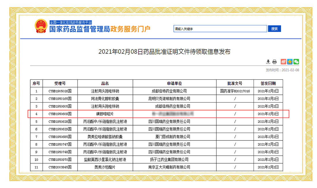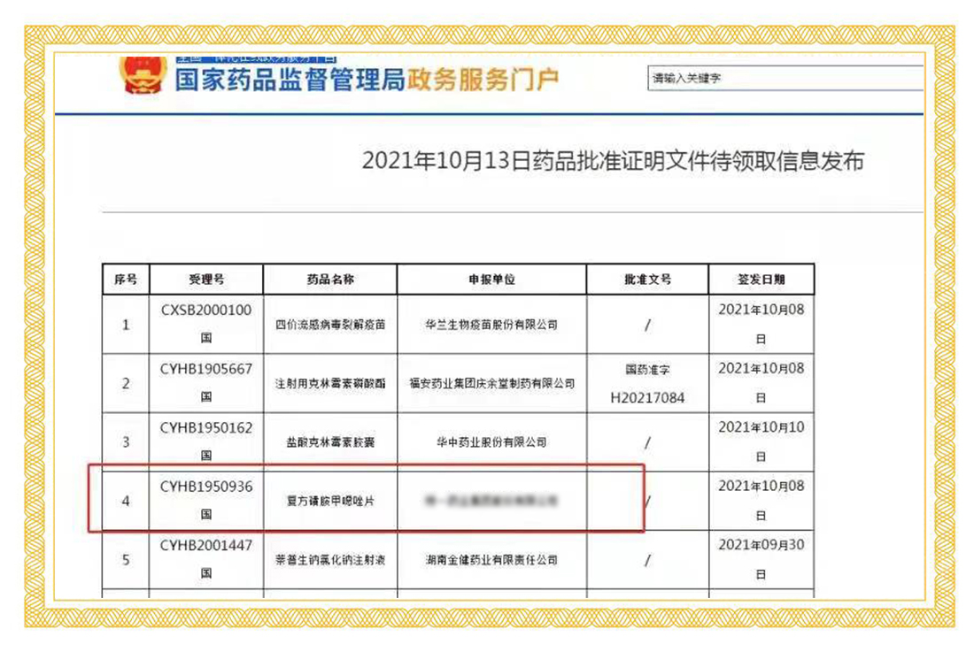 2021年2月2日,国家药品监督管理局正式发布通知,华威医药接受委托申报的磺胺嘧啶片正式通过仿制药质量和疗效一致性评价。同时,这也是国内首家通过磺胺嘧啶片的企业。