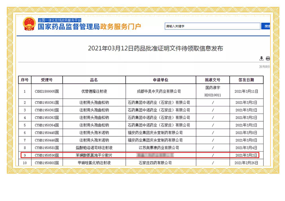 2021年3月2日,国家药品监督管理局正式发布通知,华威医药接受委托申报的苯磺酸氨氯地平分散片正式通过仿制药质量和疗效一致性评价,成为首家过评企业!