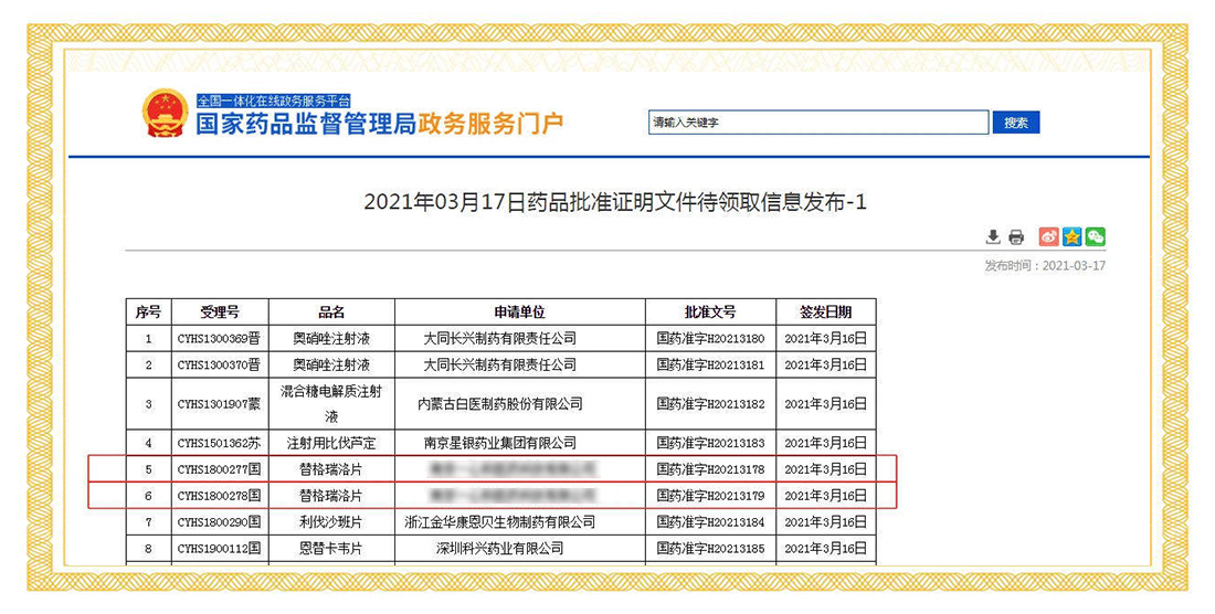 2021年3月16日,国家药品监督管理局正式发布通知,华威医药接受委托申报的的替格瑞诺片(90mg、60mg)项目正式通过审评审批,获得生产批件。