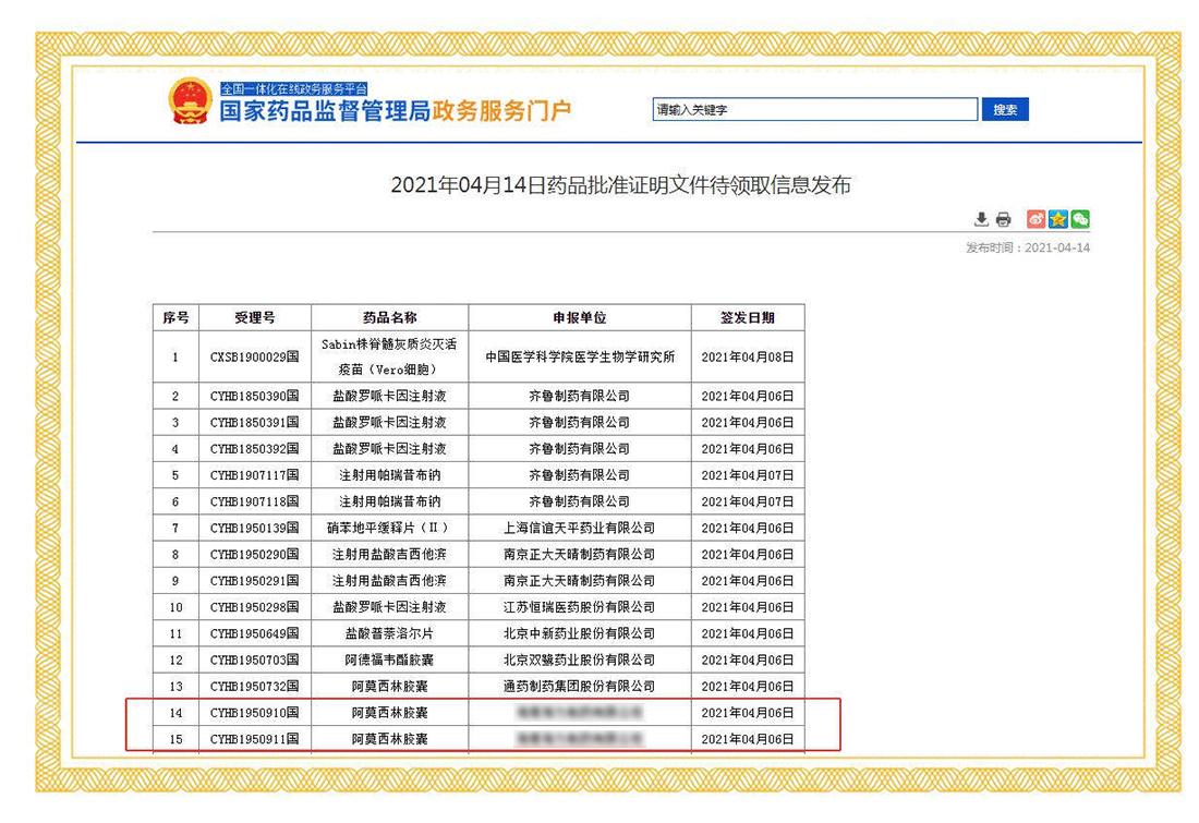 2021年4月6日,国家药品监督管理局正式发布通知,华威医药接受委托申报的阿莫西林胶囊(0.25g、0.5g)正式通过仿制药质量和疗效一致性评价。
