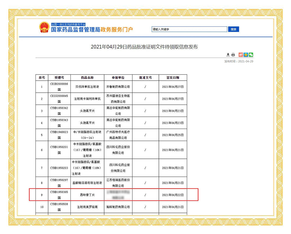 2021年4月22日,国家药品监督管理局正式发布通知,华威医药接受委托申报的西咪替丁片项目正式通过仿制药质量和疗效一致性评价。值得关注的是,这是国内第二家通过西咪替丁片的企业。