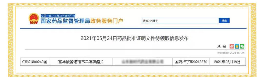 2021年5月19日,国家药品监督管理局正式发布通知,华威医药接受委托申报的富马酸替诺福韦二吡呋酯片项目正式经国家药品监督管理局批准上市,批准文号:国药准字号H20213370。