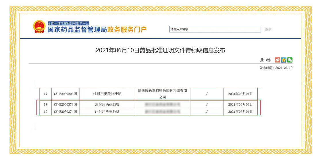 2021年6月4日,国家药品监督管理局正式发布通知,华威医药接受委托申报的注射用头孢他啶(0.5g、1.0g)正式通过仿制药质量和疗效一致性评价。
