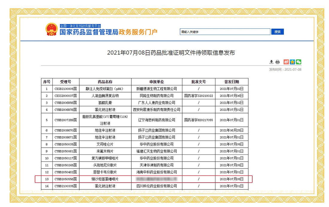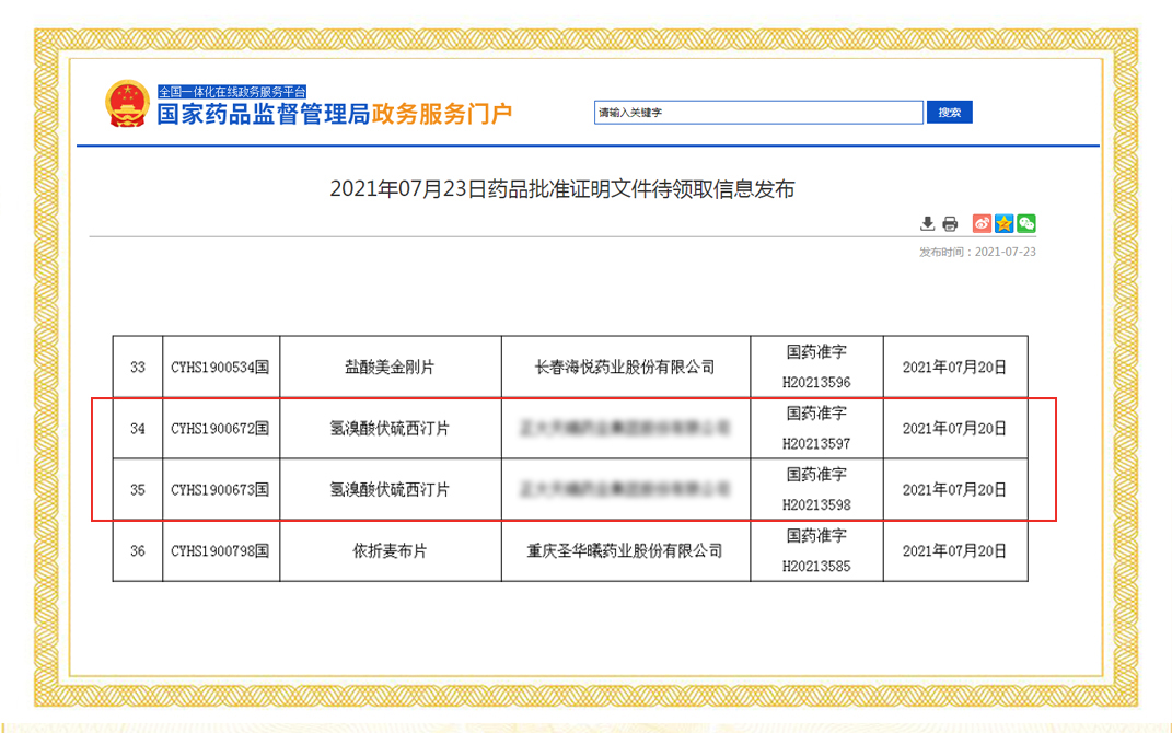 2021年7月5日,国家药品监督管理局正式发布通知,华威医药接受委托申报的缬沙坦氢氯噻嗪片项目正式通过仿制药质量和疗效一致性评价。值得关注的是,这是国内第四家通过缬沙坦氢氯噻嗪片的企业。