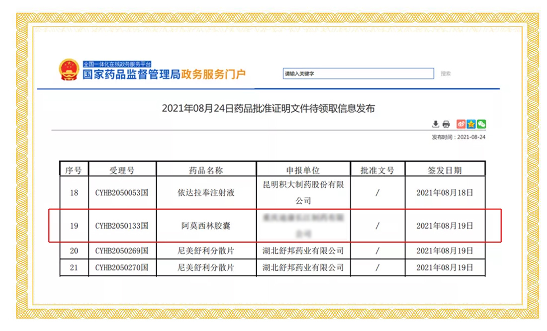 2021年8月19日,国家药品监督管理局正式发布通知,华威医药接受委托申报的阿莫西林胶囊正式通过仿制药质量和疗效一致性评价。