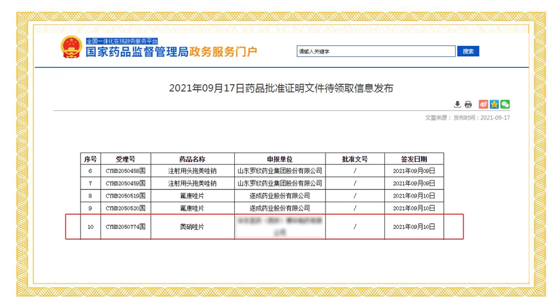 2021年9月10日,国家药品监督管理局正式发布通知,华威医药接受委托申报的奥硝唑片项目正式通过仿制药质量和疗效一致性评价。