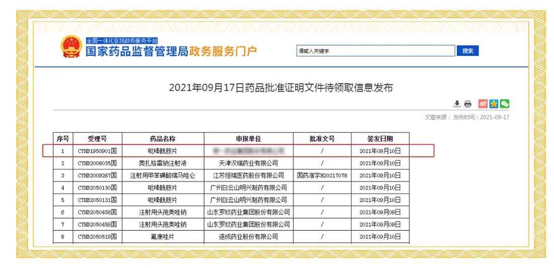2021年9月10日,国家药品监督管理局正式发布通知,华威医药接受委托申报的吡嗪酰胺片项目正式通过仿制药质量和疗效一致性评价。