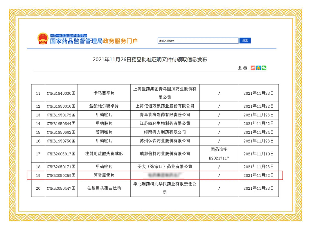 2021年11月22日,国家药品监督管理局正式发布通知,华威医药接受委托申报的阿奇霉素片项目正式通过仿制药质量和疗效一致性评价。