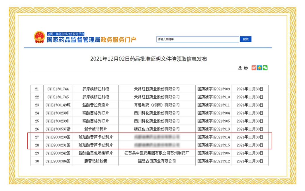 2021年11月30日,国家药品监督管理局正式发布通知,华威医药接受委托申报的琥珀酸普芦卡必利片(1mg、2mg)项目正式通过审评审批,获得生产批件。