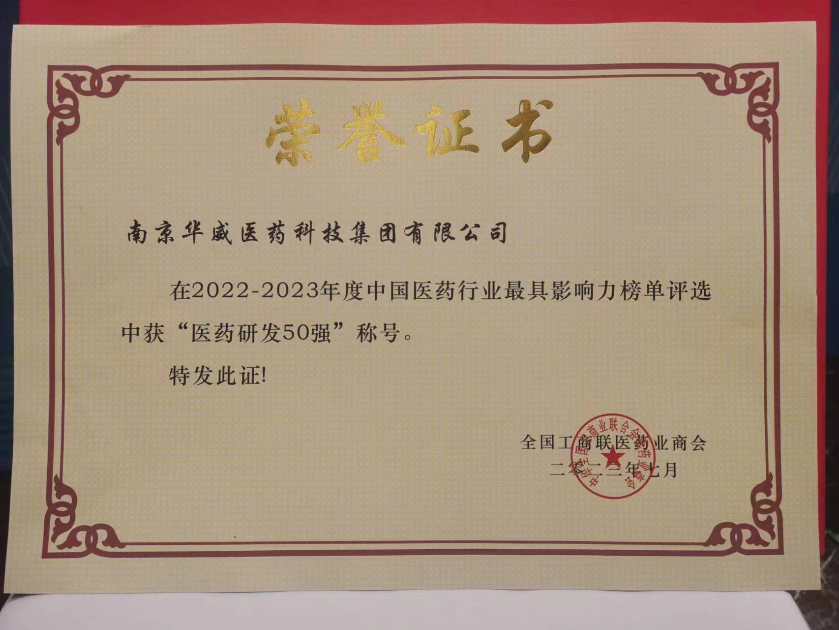 2023年7月4日,由全国工商联医药业商会、黑龙江省工商联、黑龙江省发改委共同主办的“2022-2023年度中国医药行业最具影响力榜单发布会第十五届中国医药产业发展高峰论坛”正式发布了——“2022-2023年度中国医药行业最具影响力榜单”,华威医药凭借自身雄厚实力再次荣耀入选“中国医药研发50强企业“。