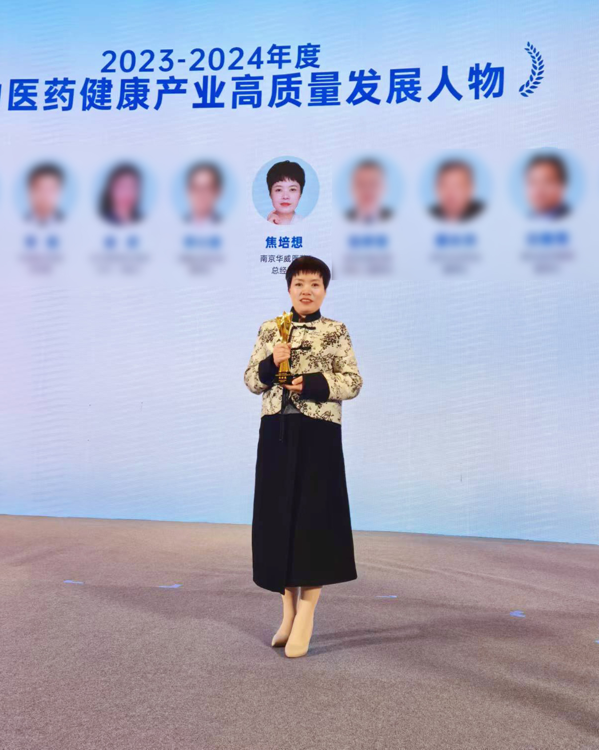 在此次论坛上,华威医药总经理焦培想女士因其在推动医药健康产业高质量发展的杰出贡献,荣获了“2023-2024年度推动医药健康产业高质量发展人物”这一重要奖项,成为本届论坛的一大亮点。
