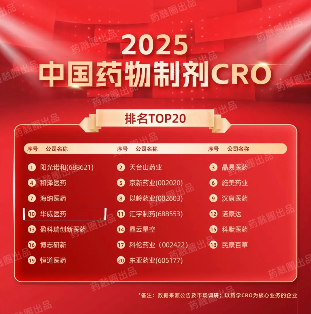 8月1日,在2025CMC-CHINA第七届中国制药工业博览会的盛典上,备受行业瞩目的《2025年中国制药工业TOP101》及10大核心产业链榜单正式揭晓。华威医药凭借卓越的综合实力,一举斩获三项重磅荣誉:强势入选“2025中国药物制剂CRO排名TOP20”、总经理焦培想女士荣膺“中国医药CRO企业领军创始人”称号、同时获评“药融圈2025生态合作伙伴”。三大奖项的加冕,全面彰显了华威医药在技术研发、领导力建设及产业协作方面的标杆地位。
